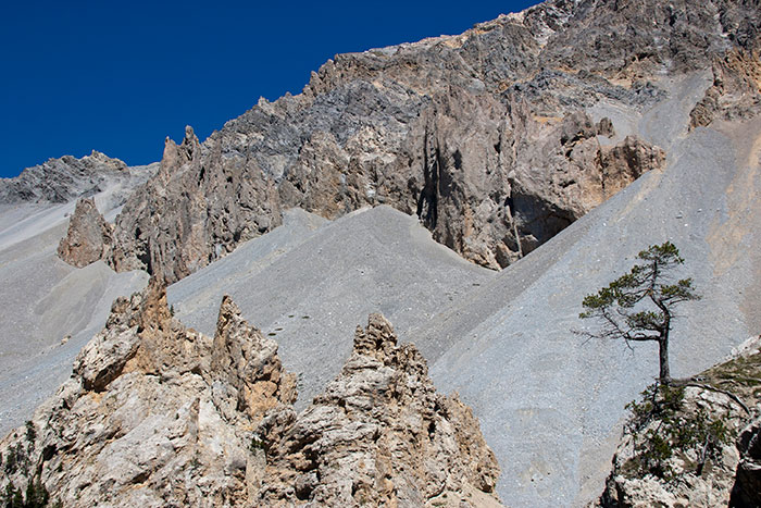 Dans des nappes d’éboulis fins percent çà et là des pitons de cargneules.